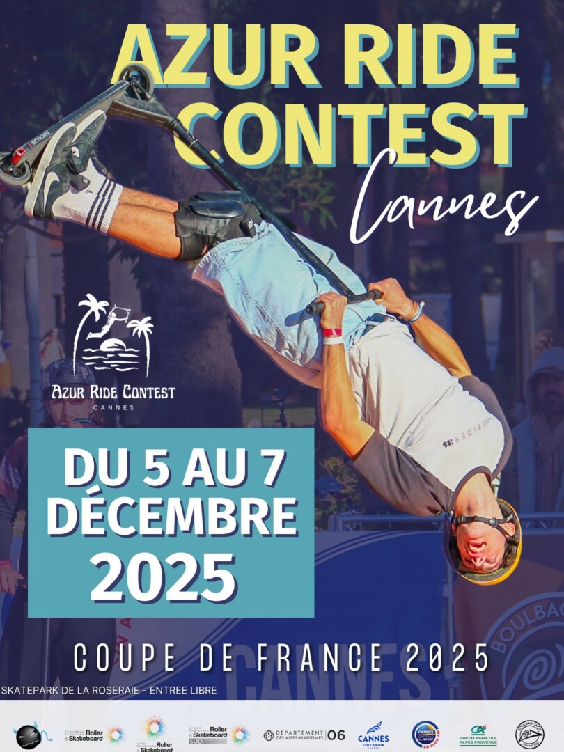 L’Azur Ride Contest Cannes, étape de la Coupe de France 2025, se déroulera du 5 au 7 décembre 2025 au Bowl de Cannes (Skatepark de la Roseraie).