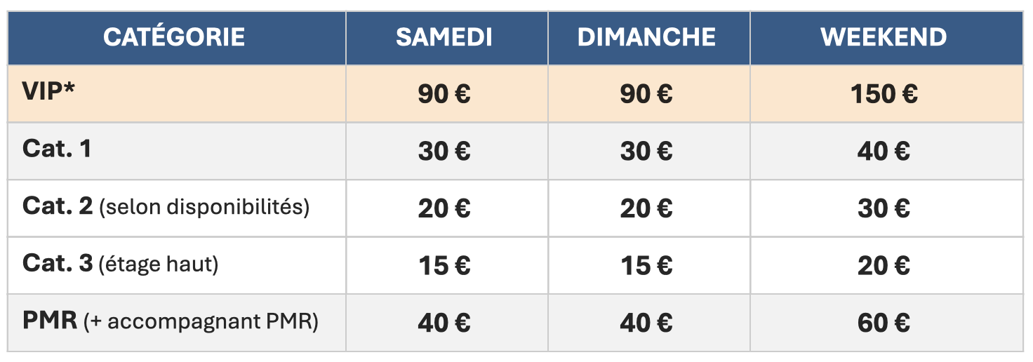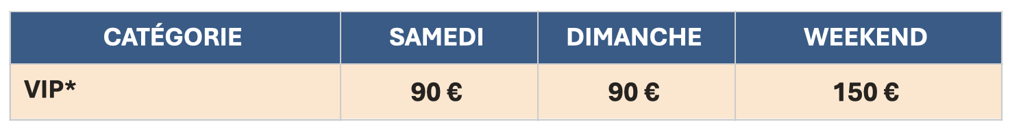 *VIP inclut : Places premium + Buffet + Boissons + Vestiaires