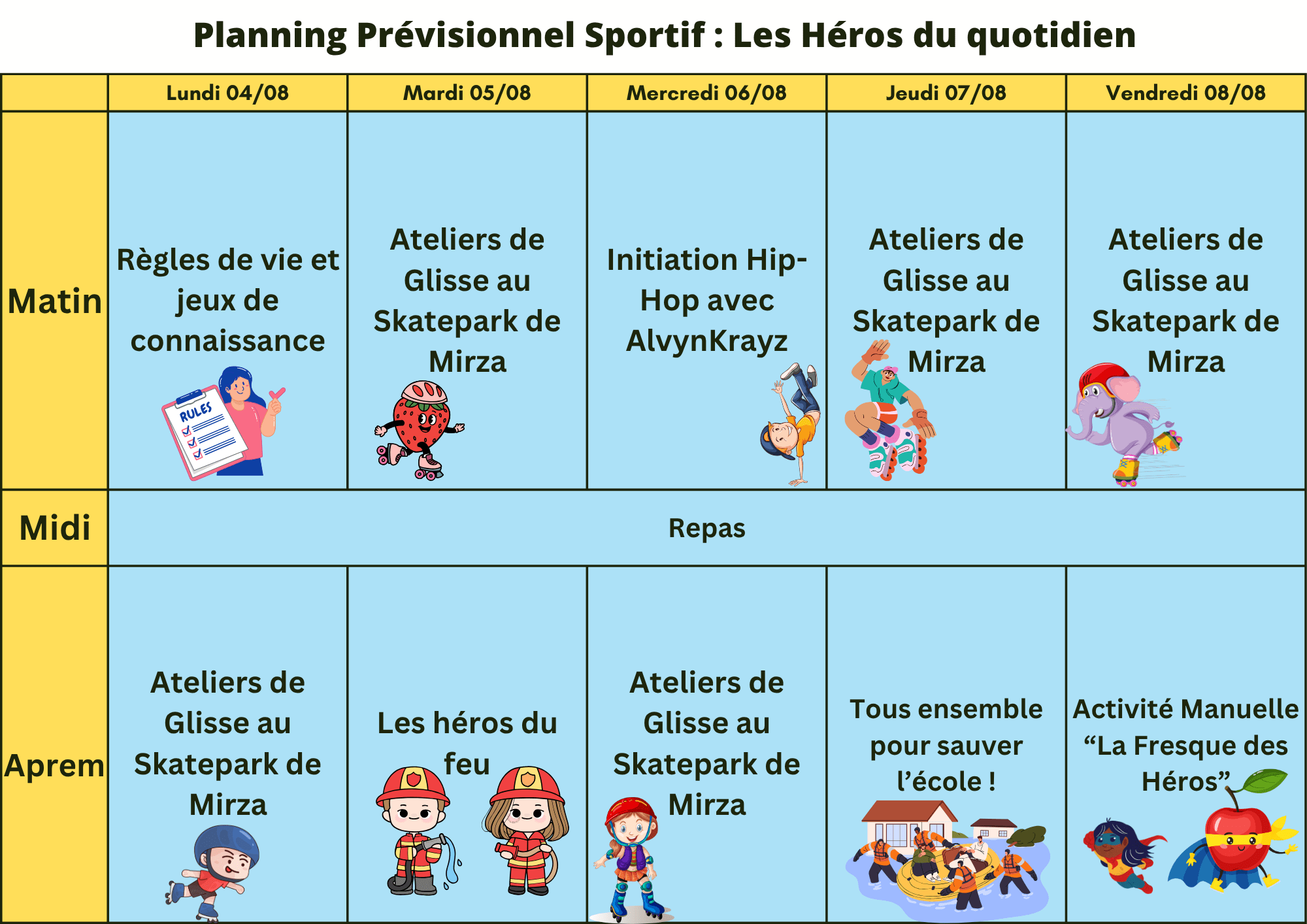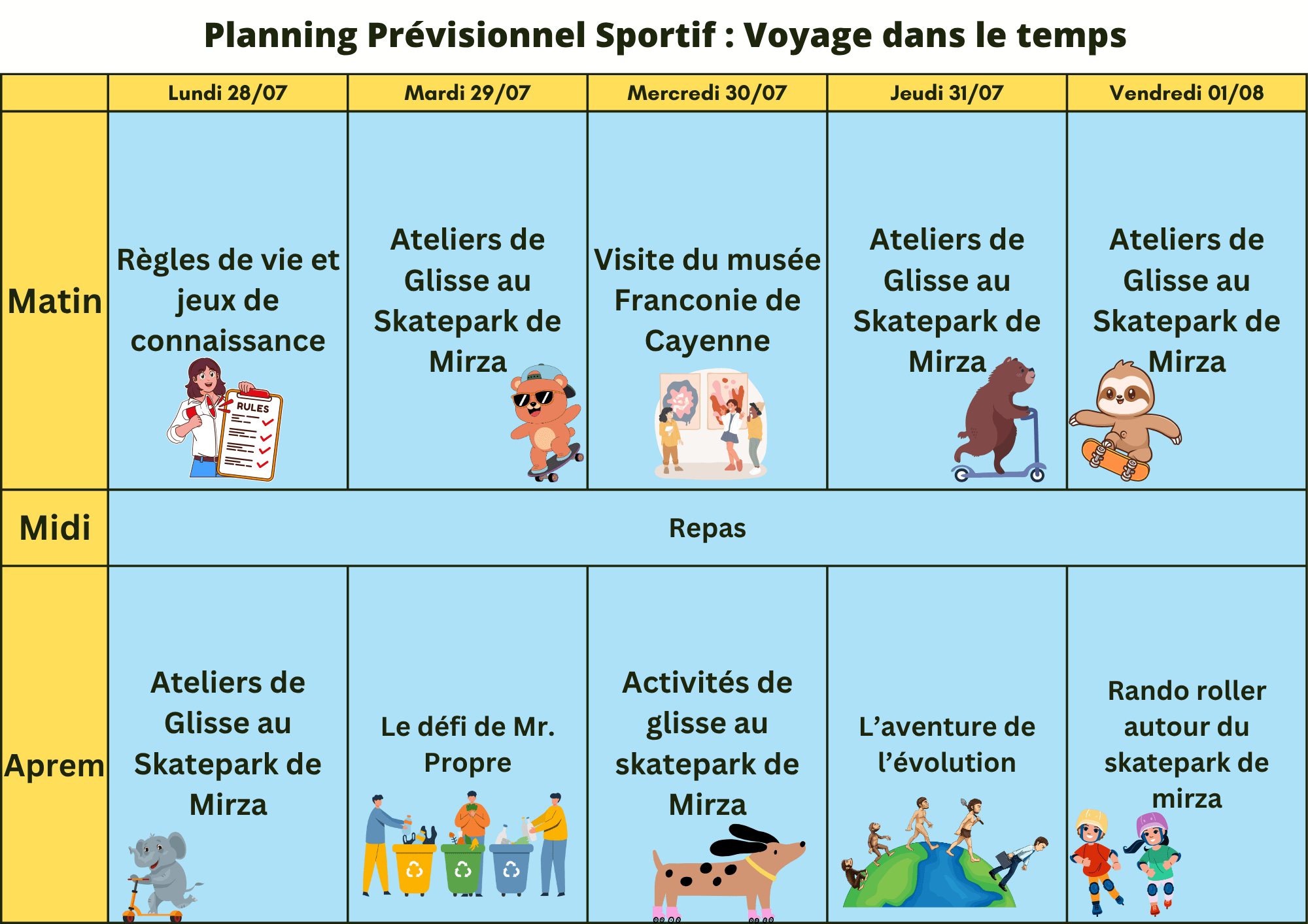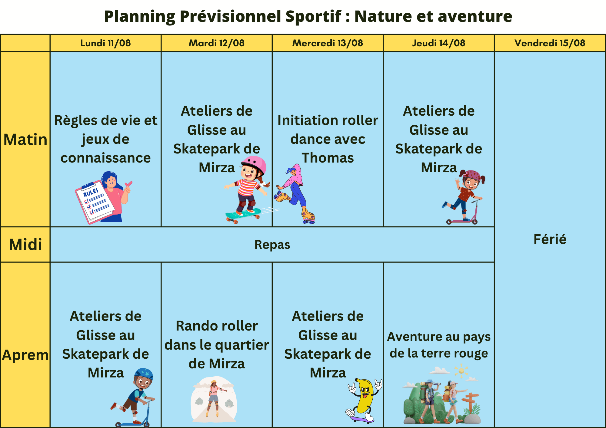 Matinée seulement, l’enfant a une activité sportive (roller, skateboard ou trottinette) tous les matins. Les activités se déroulent au Skatepark Municipal de Mirza.
