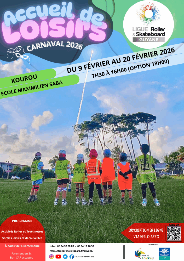 La Ligue Roller & Skateboard Guyane organise sur les communes de Cayenne et Kourou, pendant toutes les vacances scolaires, des accueils de loisirs du lundi au vendredi, de 7h30 à 16h00.