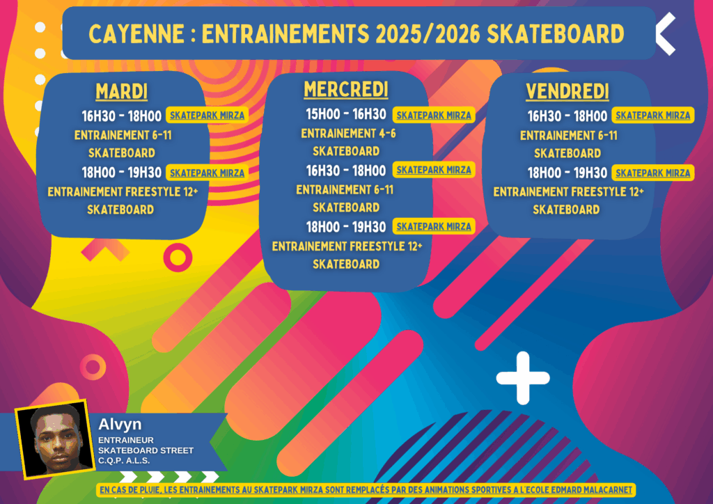 Les entrainements de skateboard sont assurés par Alvyn SIOURAKAN-BADALOU