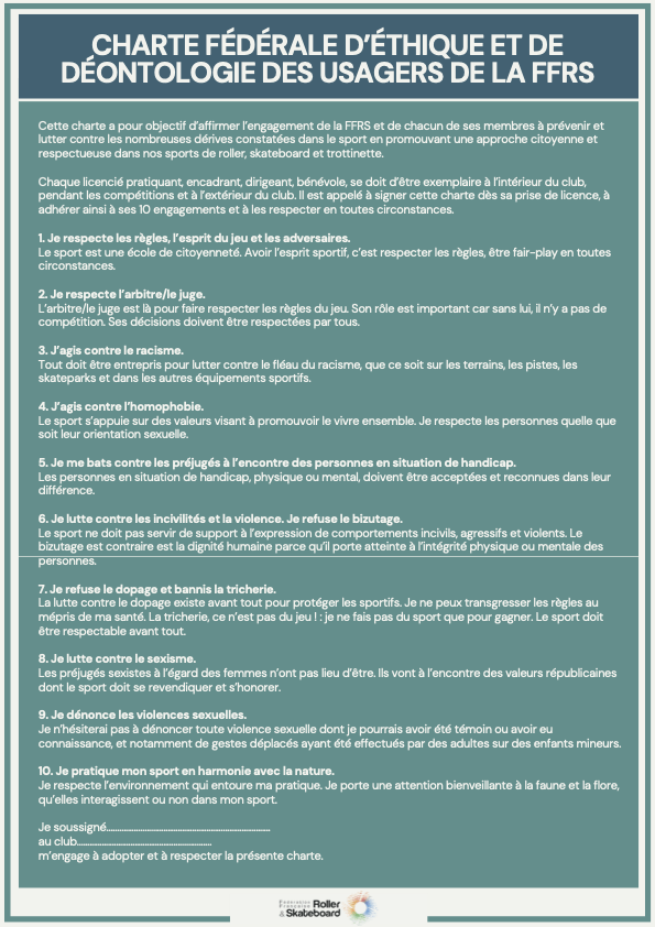 Début 2019, la FFRS s’est engagée dans la lutte contre les violences sexuelles avant d’élargir le champ de son action à toutes les formes de violences début 2022. L’objectif est de garantir à l’ensemble de ses licenciés, pratiquants, encadrants, dirigeants ou bénévoles, une pratique des sports de roller, skateboard et trottinette sécurisée.