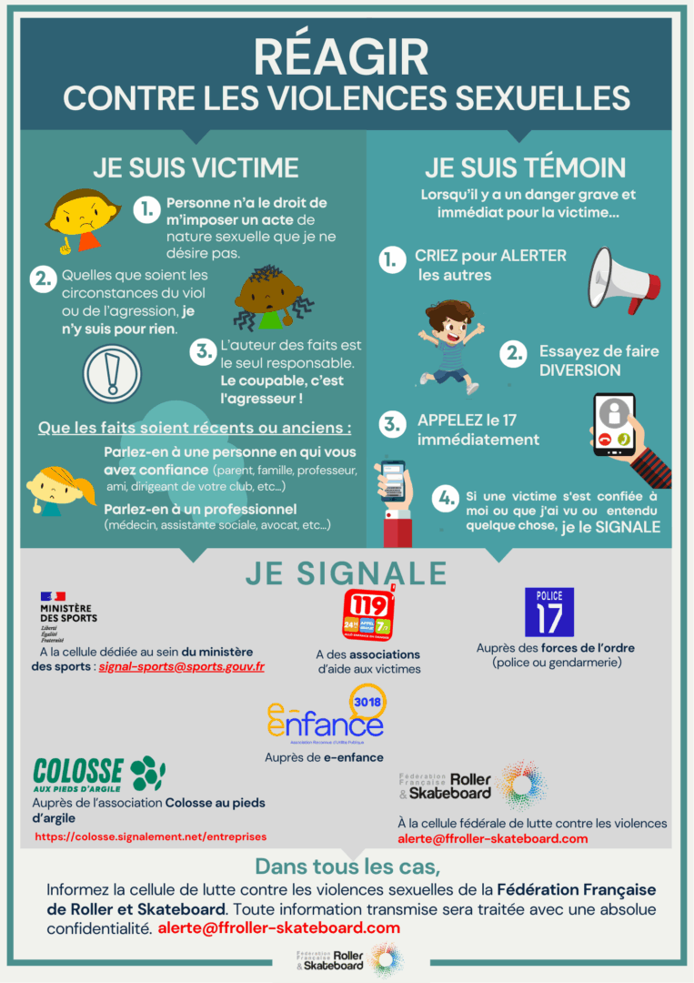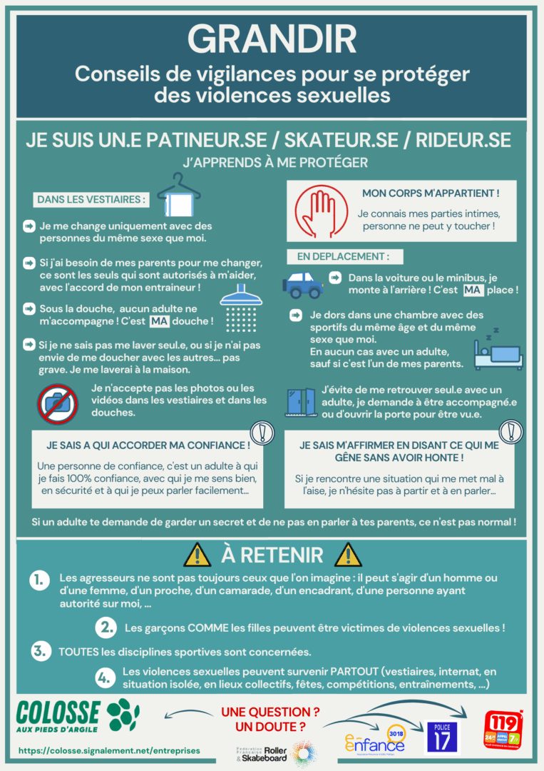 Tous les acteurs de la fédération (élus, licenciés, clubs, comités, ligues) doivent se mobiliser et faire remonter systématiquement, à la Fédération (alerte@ffroller-skateboard.com) ou à Colosse aux pieds d’Argile, les signalements dont ils disposent, sous peine de sanction disciplinaire.